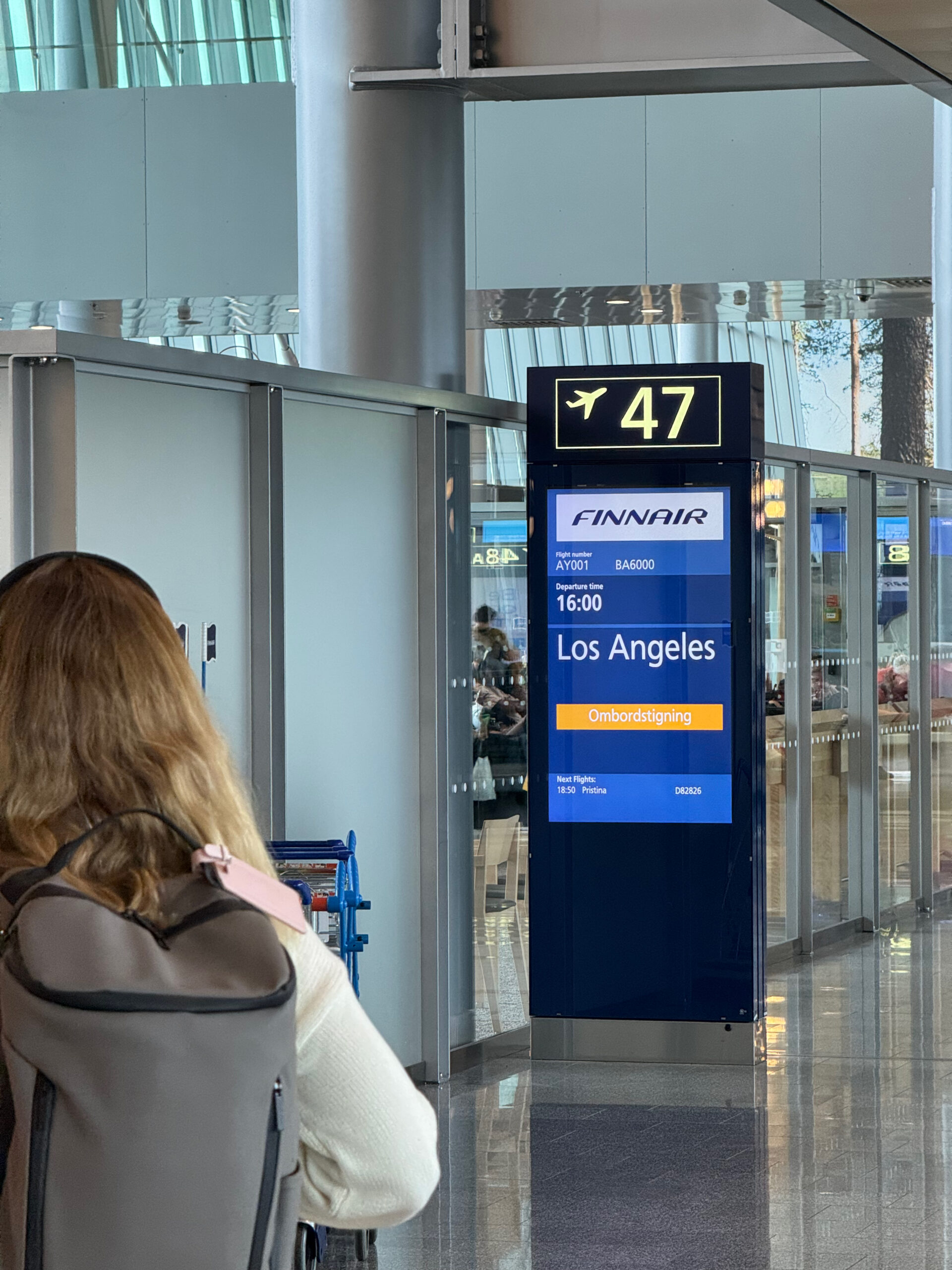 My flight from Stockholm was delayed, which left me with only a 50-minute layover. I had to clear immigration before heading to my gate for the connecting flight to Los Angeles. However, Helsinki Airport was incredibly efficient, and they even had a dedicated area for passengers flying on AY1 (Flight 1) to LAX. I made it to the gate 25 minutes before departure, where I noticed many other passengers connecting to this flight.