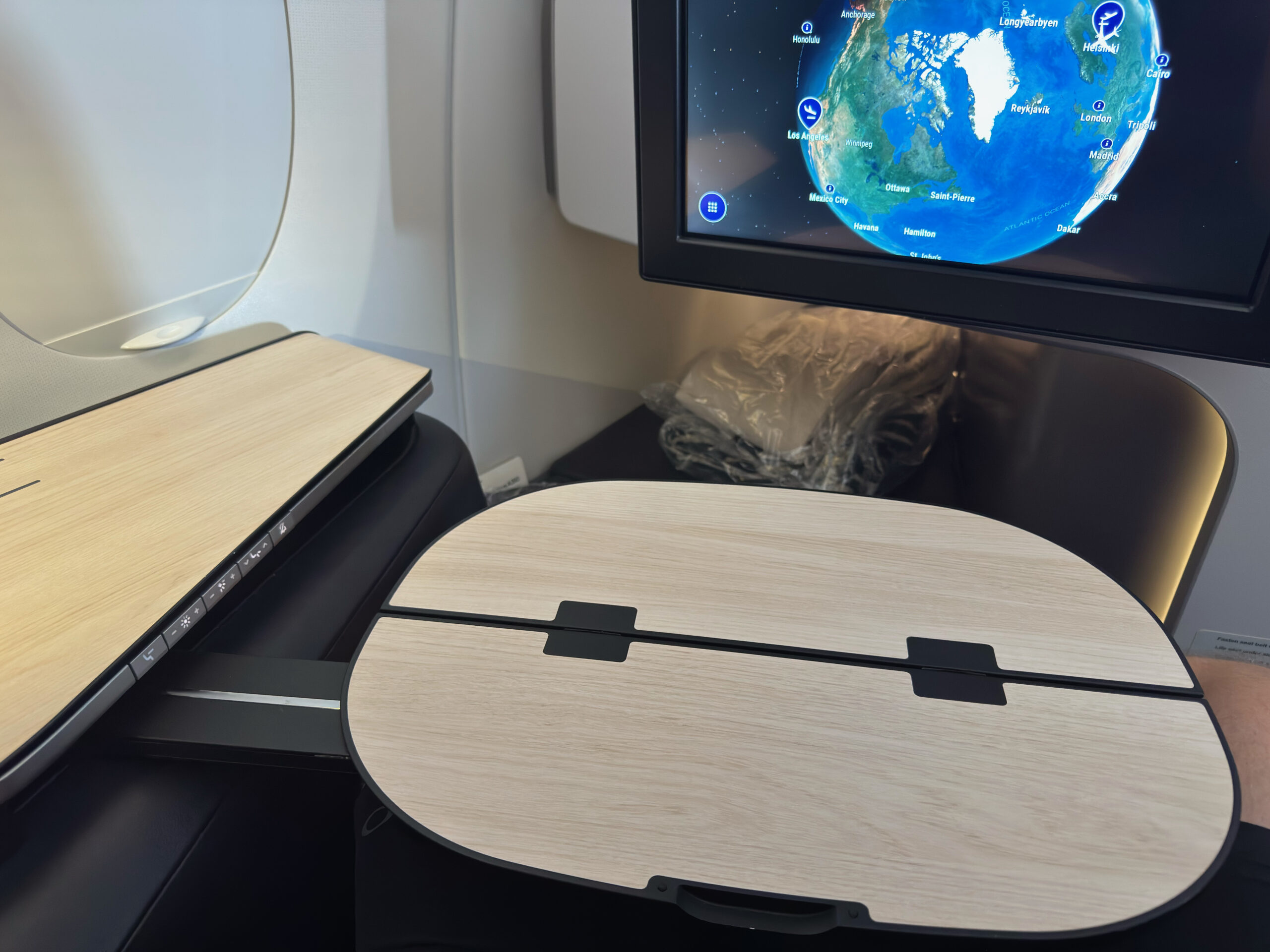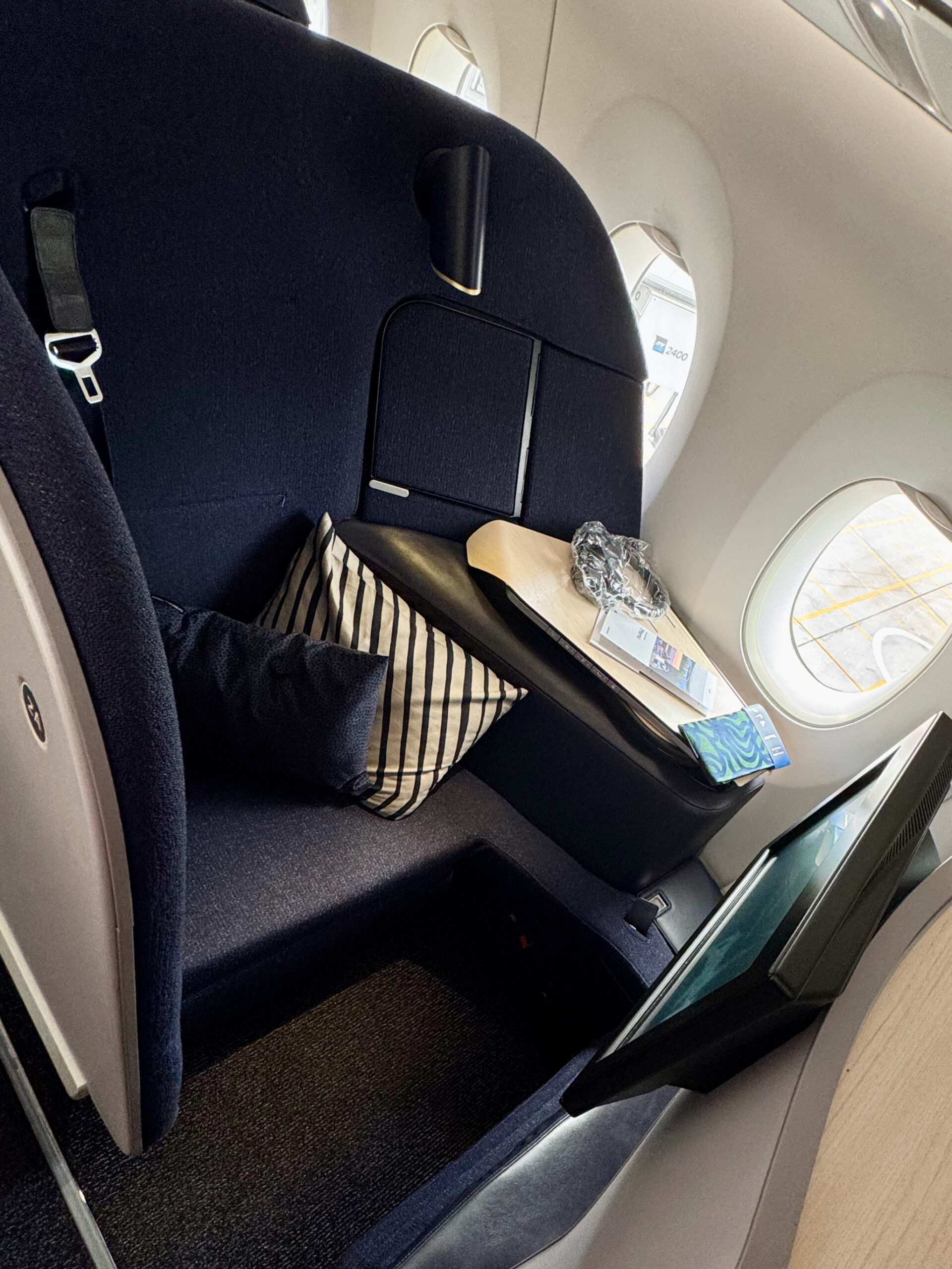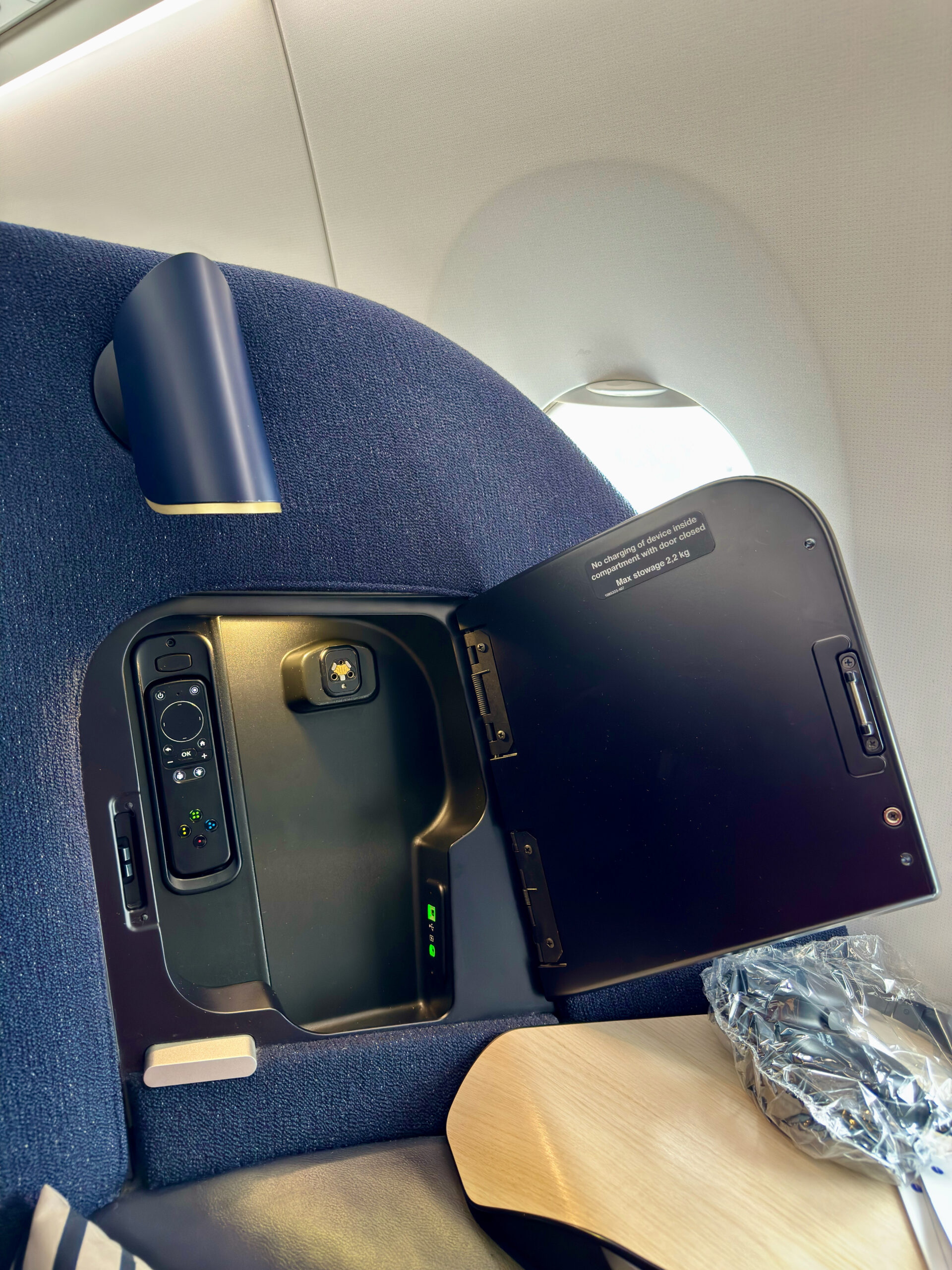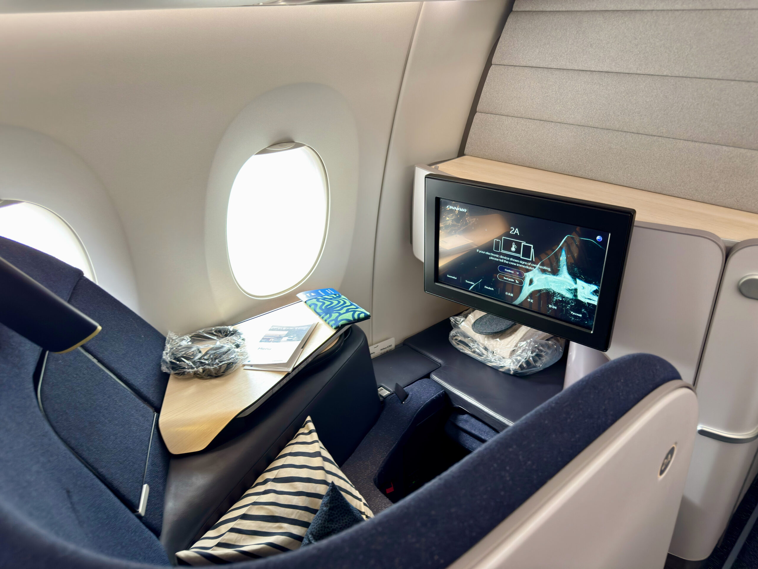 Boarding the A350-900, I found my seat at 2A, a bulkhead window seat. Finnair’s new Collins AirLounge seat was immediately impressive, furniture-like in its design and incredibly inviting. Unlike most business class seats, this one doesn’t recline. Instead, the seat back stays upright, but a leg rest pops up, creating a lie-flat position. It was a comfortable and cozy seat despite the lack of reclining functionality.