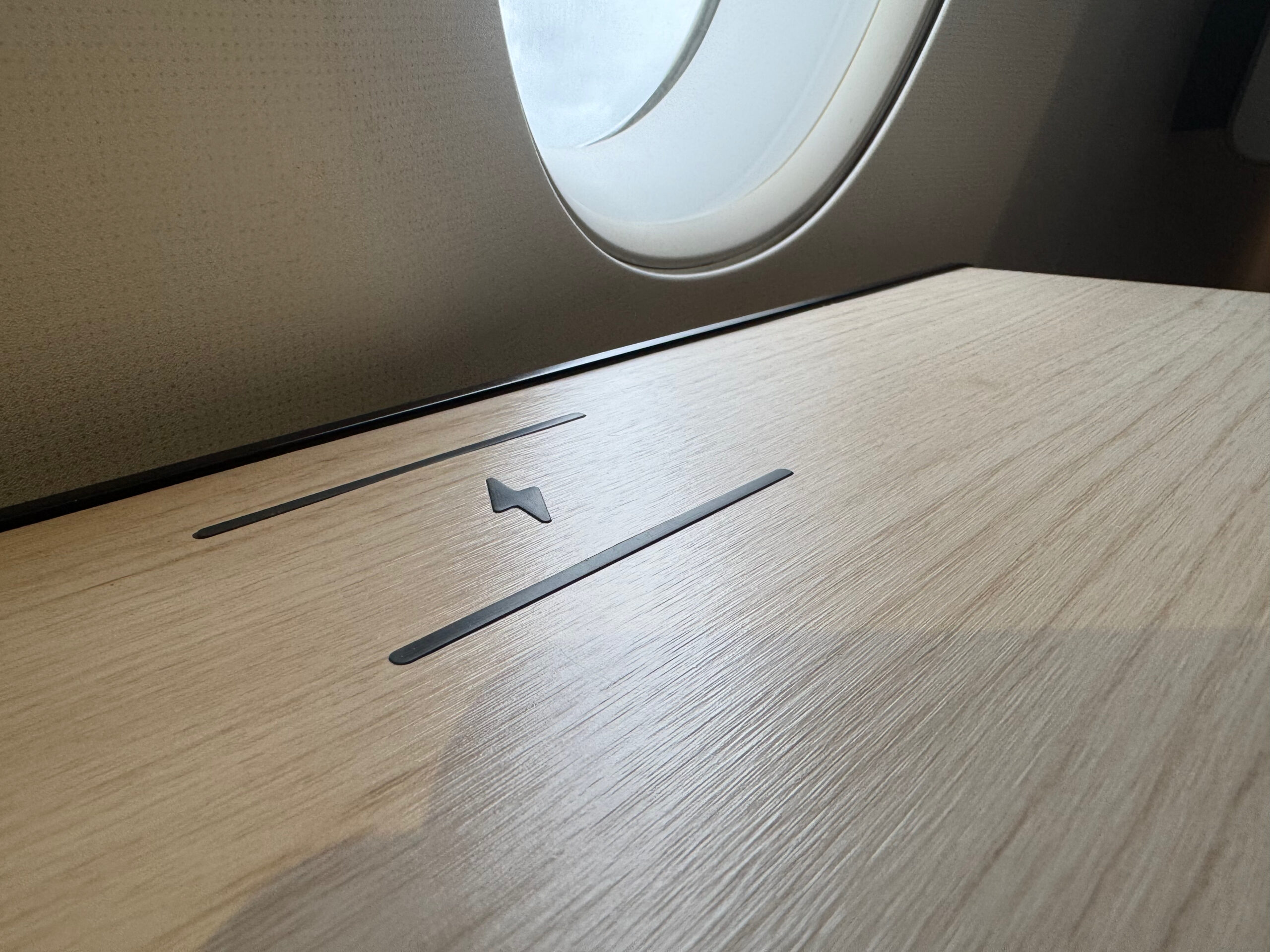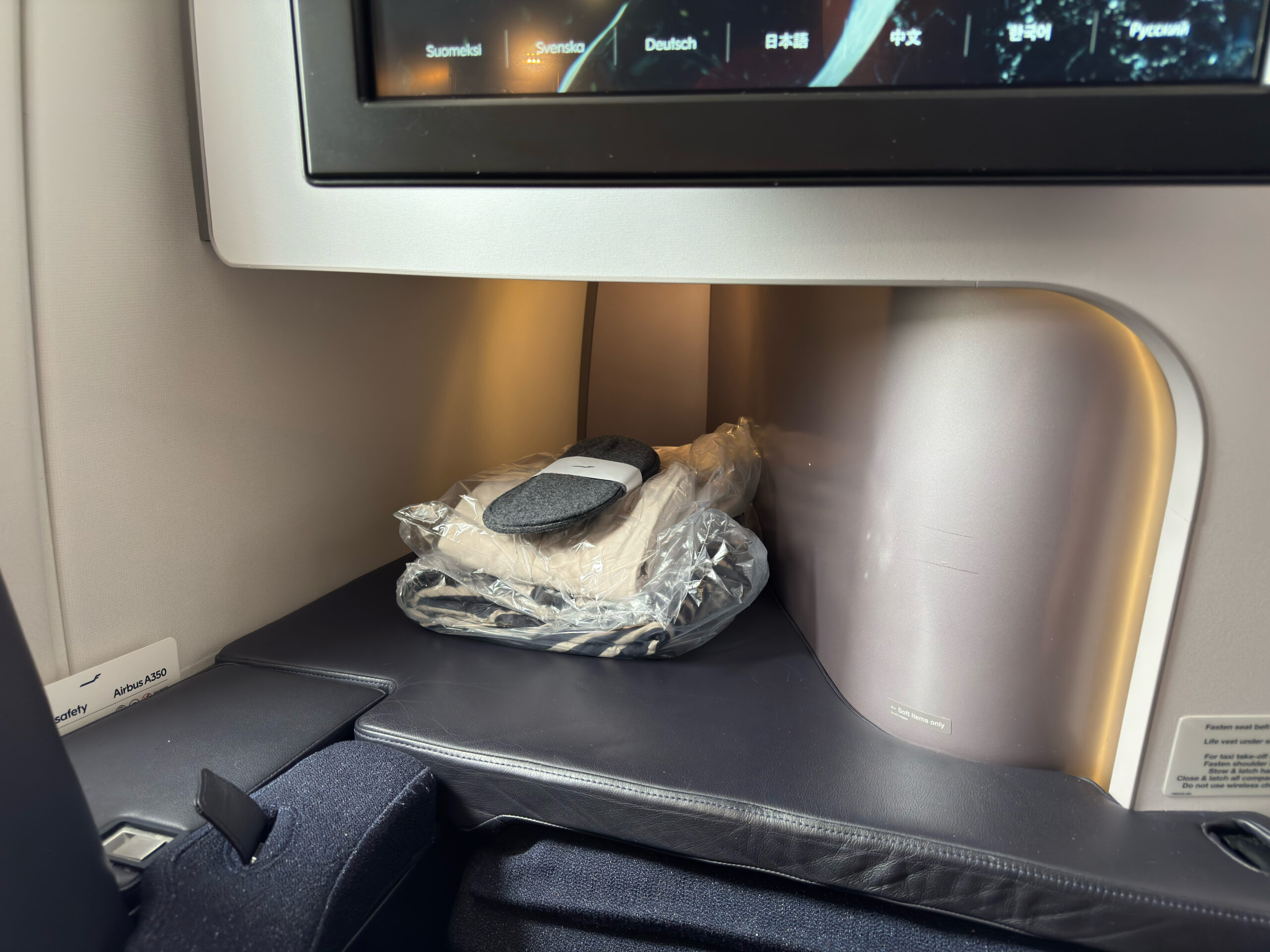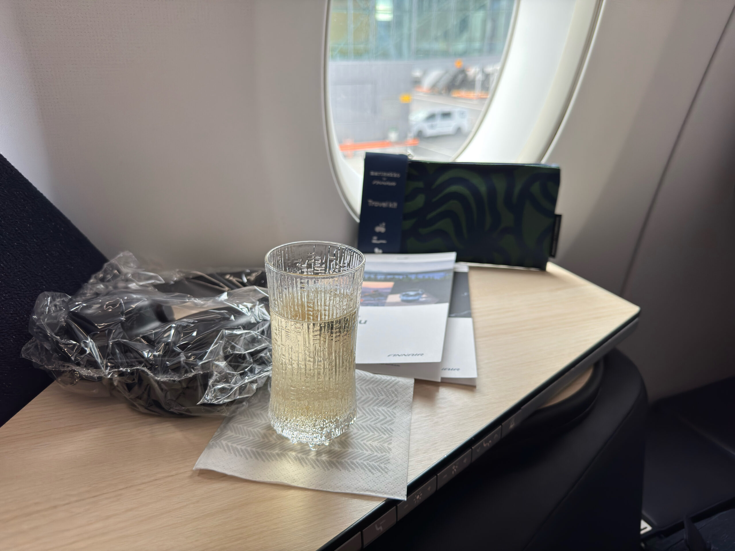 Before takeoff, champagne was served as a pre-departure beverage, and a range of amenities were already waiting at my seat: noise-canceling headphones, a Marimekko amenity kit, slippers, a mattress pad, and a blanket. The seat also had numerous power options, including an AC outlet, USB-C and USB-A ports, plus a built-in wireless charger on the side table.