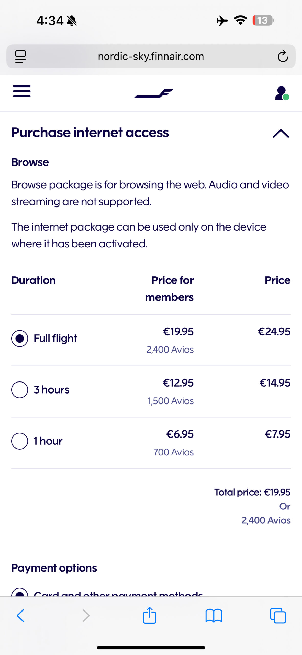 WiFi is available, though Business Class passengers only receive one hour for free. The full-flight pass was priced at EUR 24.95. The internet speeds were slower than expected, as the plane was equipped with the Panasonic system, whereas Finnair’s domestic flights use the faster ViaSat system.