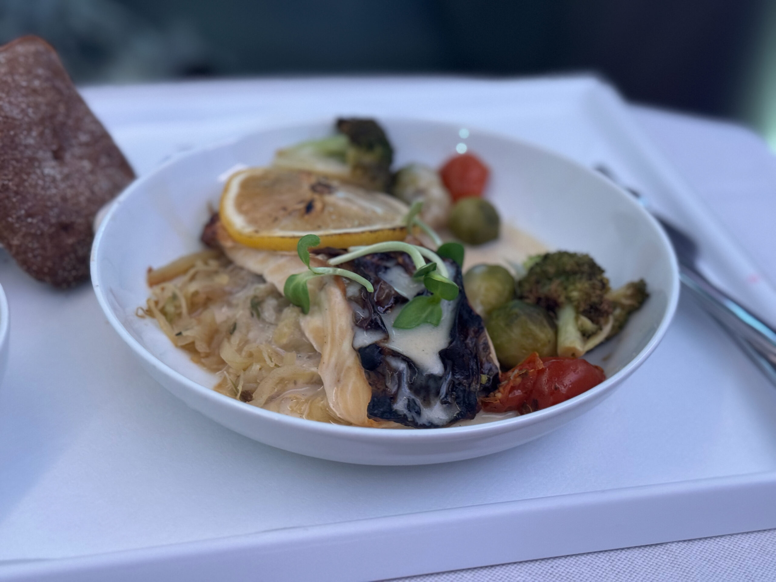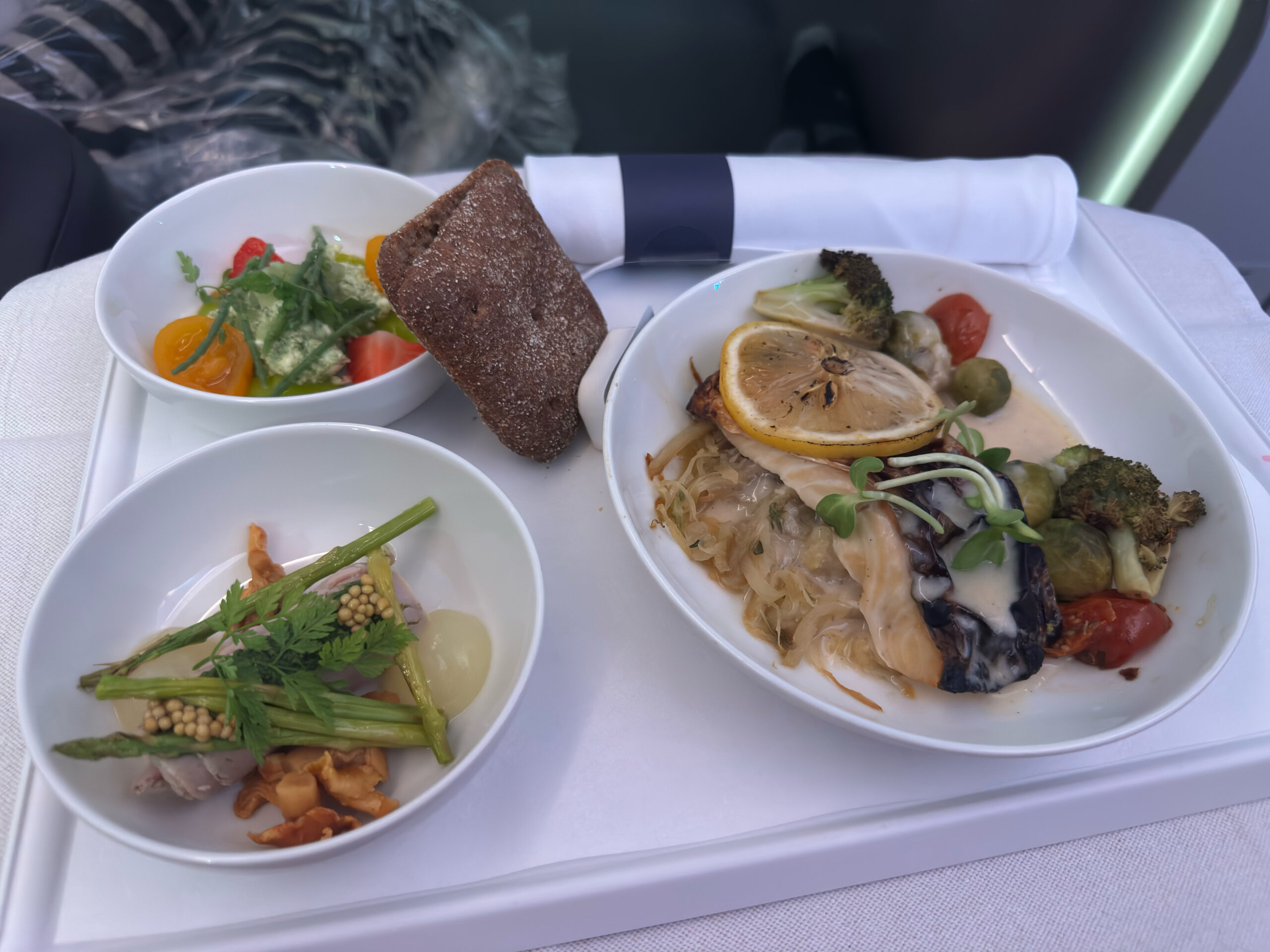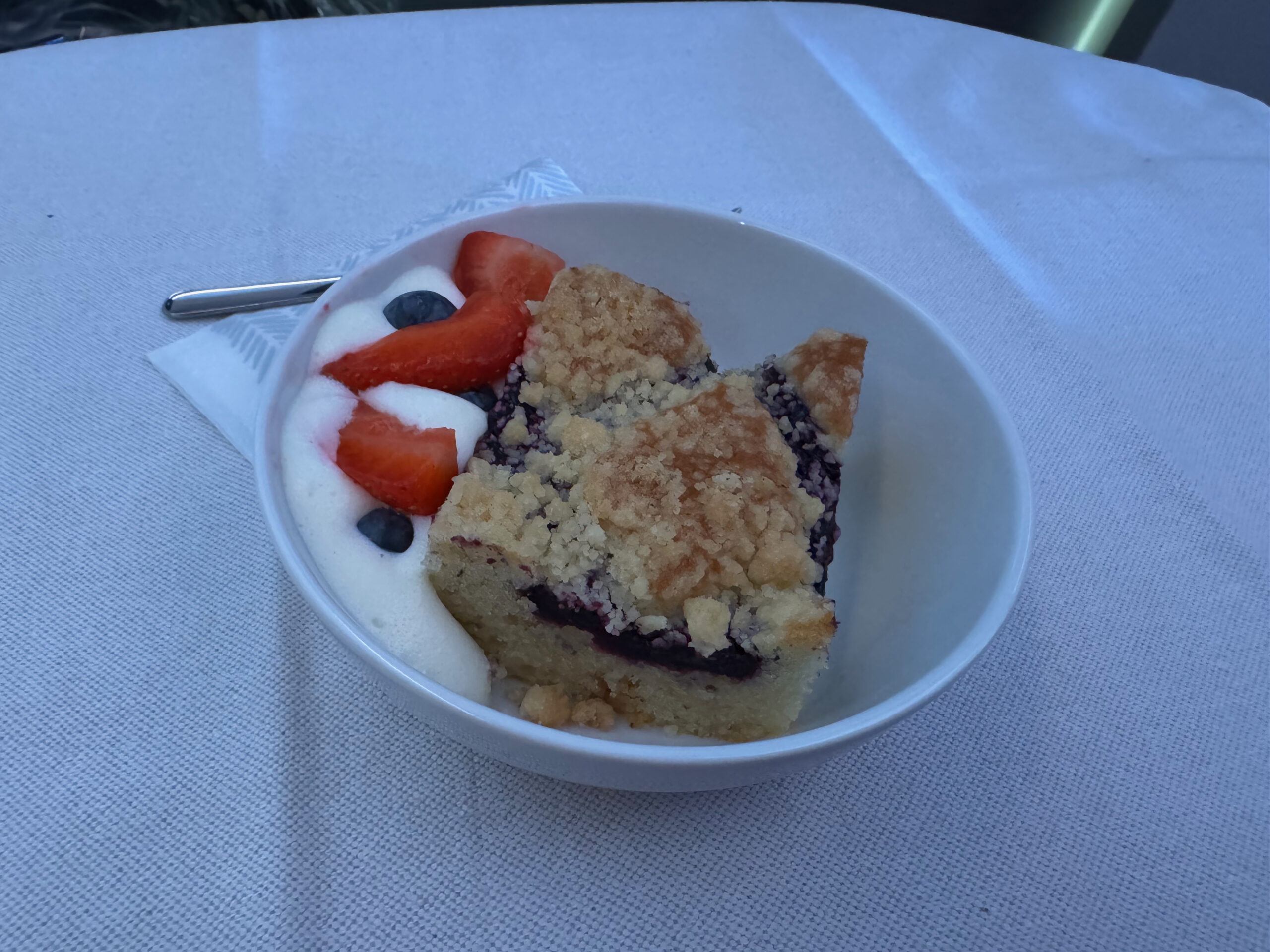 We took off about 30 minutes later than scheduled, but fortunately, all connecting passengers were able to make the flight. Once airborne, dinner was served, and I kicked things off with a Northern Blush cocktail (Mikropolis Gin, lingonberries, orange peel, and bitters) paired with some warm nuts. For the main course, I chose the roasted white fish, which was exceptionally fresh and delicious. Honestly, it was a standout meal! I wrapped up with a delicious blueberry pie, topped with fresh berries and vanilla sauce.