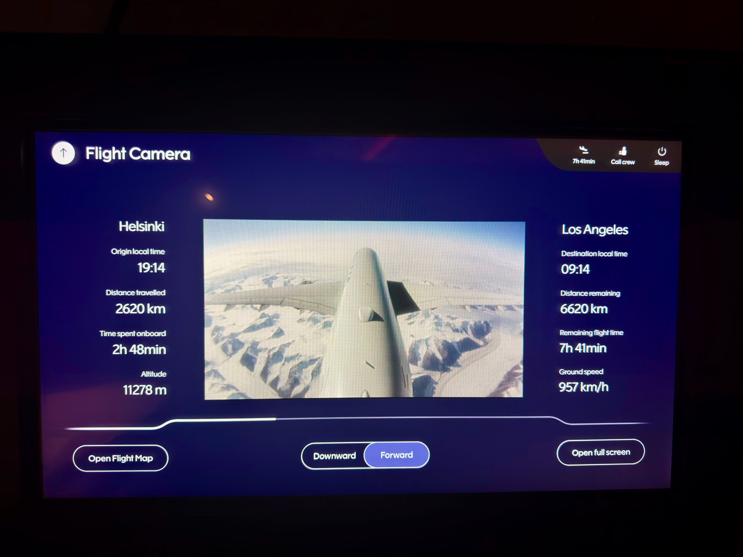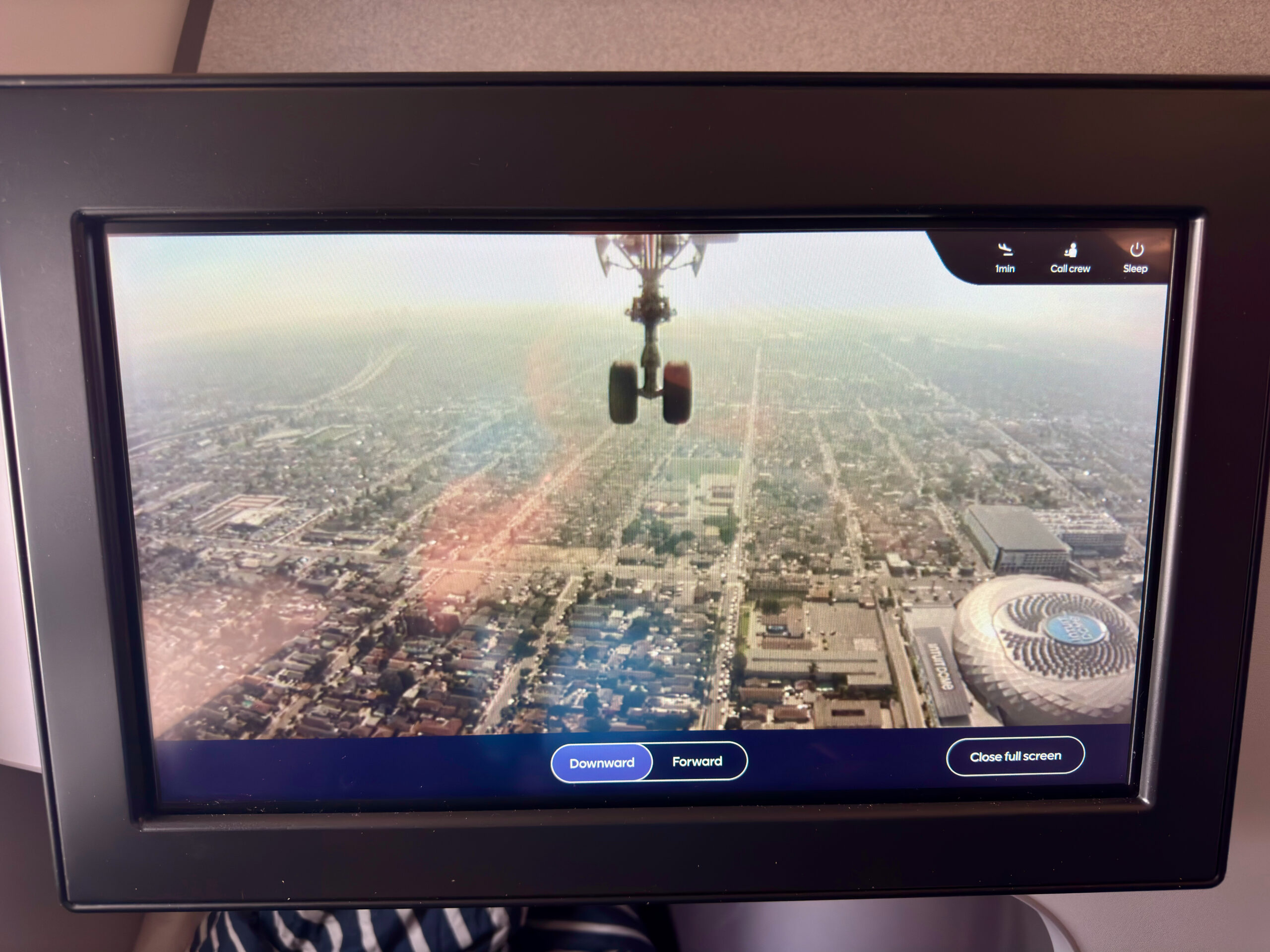 The cameras available through the in-flight entertainment system were a great touch, offering views of Greenland during the meal service and the Intuit Dome as we were landing at LAX.
